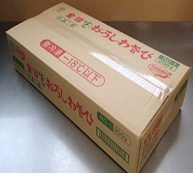 ・香り豊かな本わさびと辛味に優れた西洋わさび(弊社開発系統「白宝」)を独自の配合でブレンドし、おろしたての風味・辛味をそのままに凍結パックしたお造り用の生おろしわさびです。