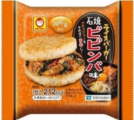 牛肉、人参、ほうれん草をコチュジャンの辛味を利かせたたれで和え、こんがり焼いたライスパテではさみ、石焼ビビンバ味に仕上げました。